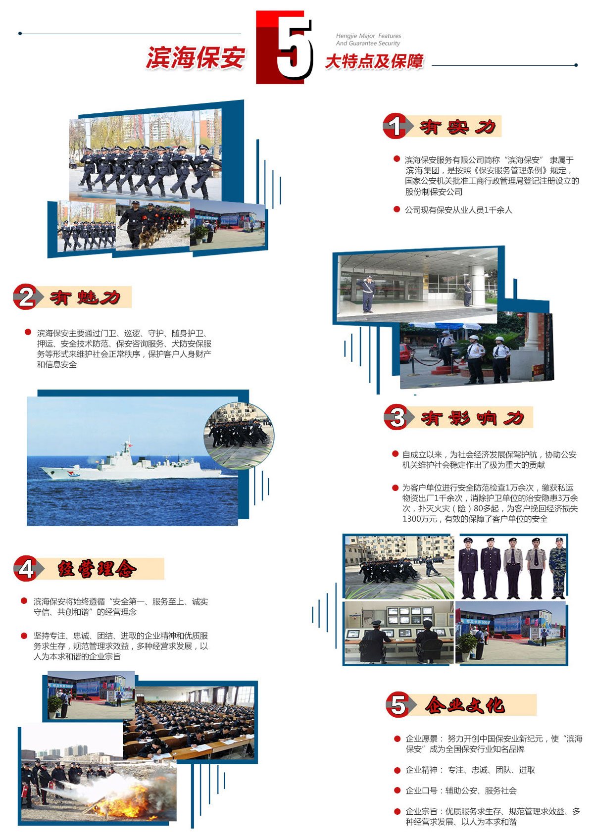 濱海保安主要通過門衛(wèi)、巡邏、守護、隨身護衛(wèi)、押運、安全技術防范、保安咨詢服務、犬防安保服務等形式來維護社會正常秩序,保護客戶人身財產和信息安全。公司現(xiàn)有保安從業(yè)人員1千余人,客戶單位涵蓋黨政機關、企事業(yè)單位、金融機構、高檔寫字樓、賓館飯店、高檔別墅、高等院校、大型商場、建筑行業(yè)等,現(xiàn)有單位100余家。